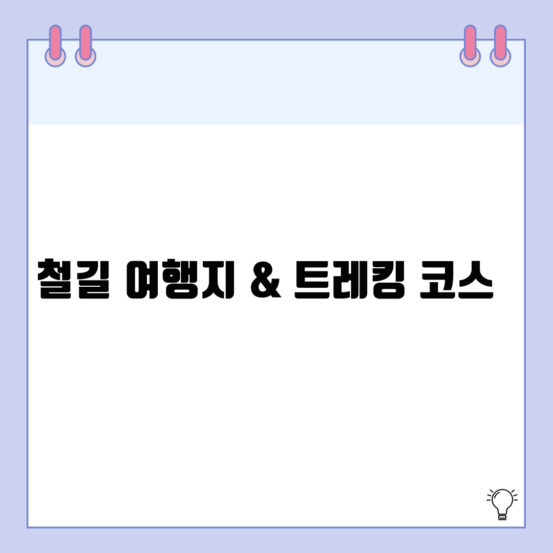 철길 여행지 & 트레킹 코스 | 기찻길 따라 걷는 감성 걷기 여행지 추천기차가 다니는 선로 옆을 걷는 길은 낭만과 여유가 함께합니다. 이번 글에서는 기찻길을 따라 즐길 수 있는 국내 대표 트레킹 코스와 함께 걷기 좋은 여행지를 지역별로 소개합니다.1. 정동진 해안선 트레킹 – 바다와 나란히 걷는 기찻길🚶♂️ 정동진역모래시계공원심곡 바다부채길까지 이어지는 해안선 걷기 코스🌊 동해안 바다와 철길이 나란히 이어져 있어 감성적인 풍경 연출🎞 드라마 ‘모래시계’로 유명한 배경지로 포토존 다수✅ 팁: 오전 시간대가 햇살과 함께 가장 걷기 좋음 / 동해바다 일출 추천2. 곡성 섬진강 기차마을 – 철도와 꽃길이 어우러진 평화로운 길🚂 섬진강 따라 이어지는 철길 옆 걷기 코스 / 봄엔 벚꽃, 여름엔 연꽃🌸 구..